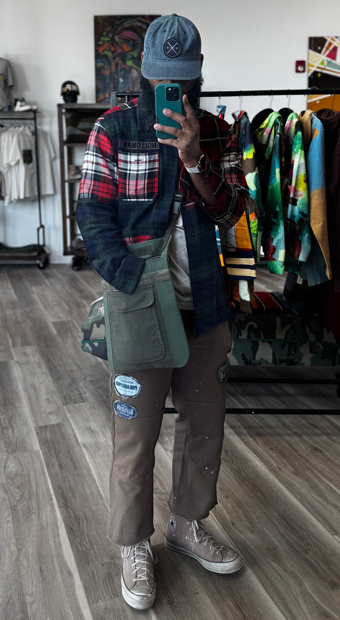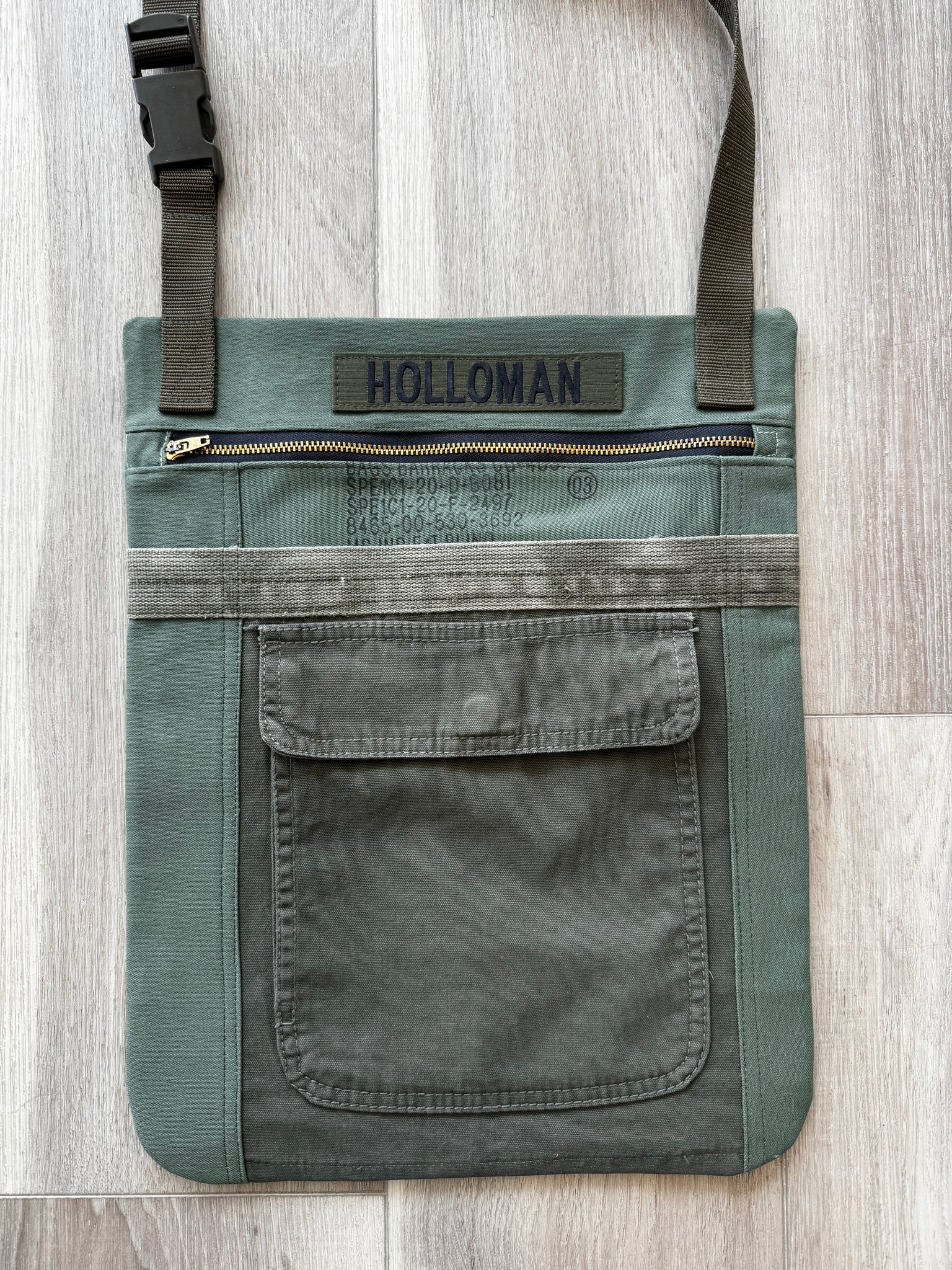 Hand made tote bag using vintage military barracks bags fabrics. Comes with attached strap and messenger style carry. Front zipper closer and cargo pocket detail.